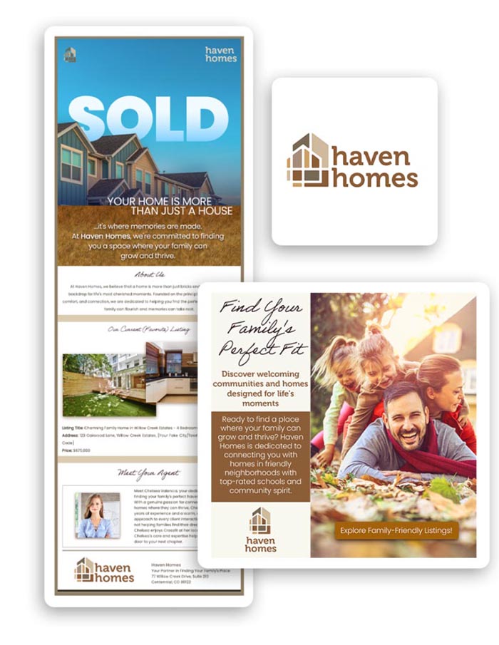 Our expert design services empower real estate agents to save time, increase leads, and build a powerful brand that stands out. Get eye-catching emails, social graphics, and videos that build deeper relationships and boost your business.